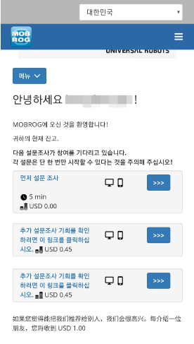 이렇게 MOBROG(몹로그) 첫화면이 한글로 보여집니다. 그리고 설문조사를 보면 달러가 보이지요? 설문을 하게 되면 받게 되는 달러 수익입니다.